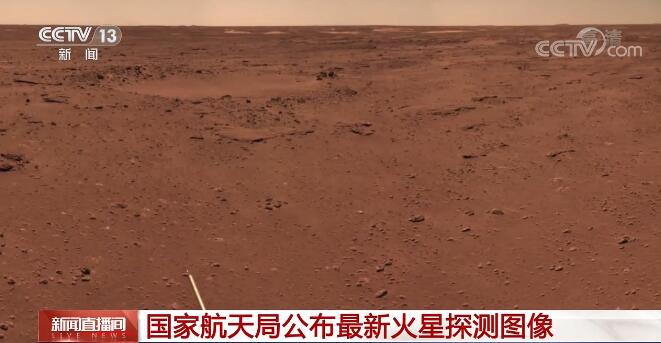 最后一张图是由祝融号火星车利用导航地形相机获取的三幅图像拼接镶嵌而成,在图中可以看到环形坑、石块等火星典型地貌。