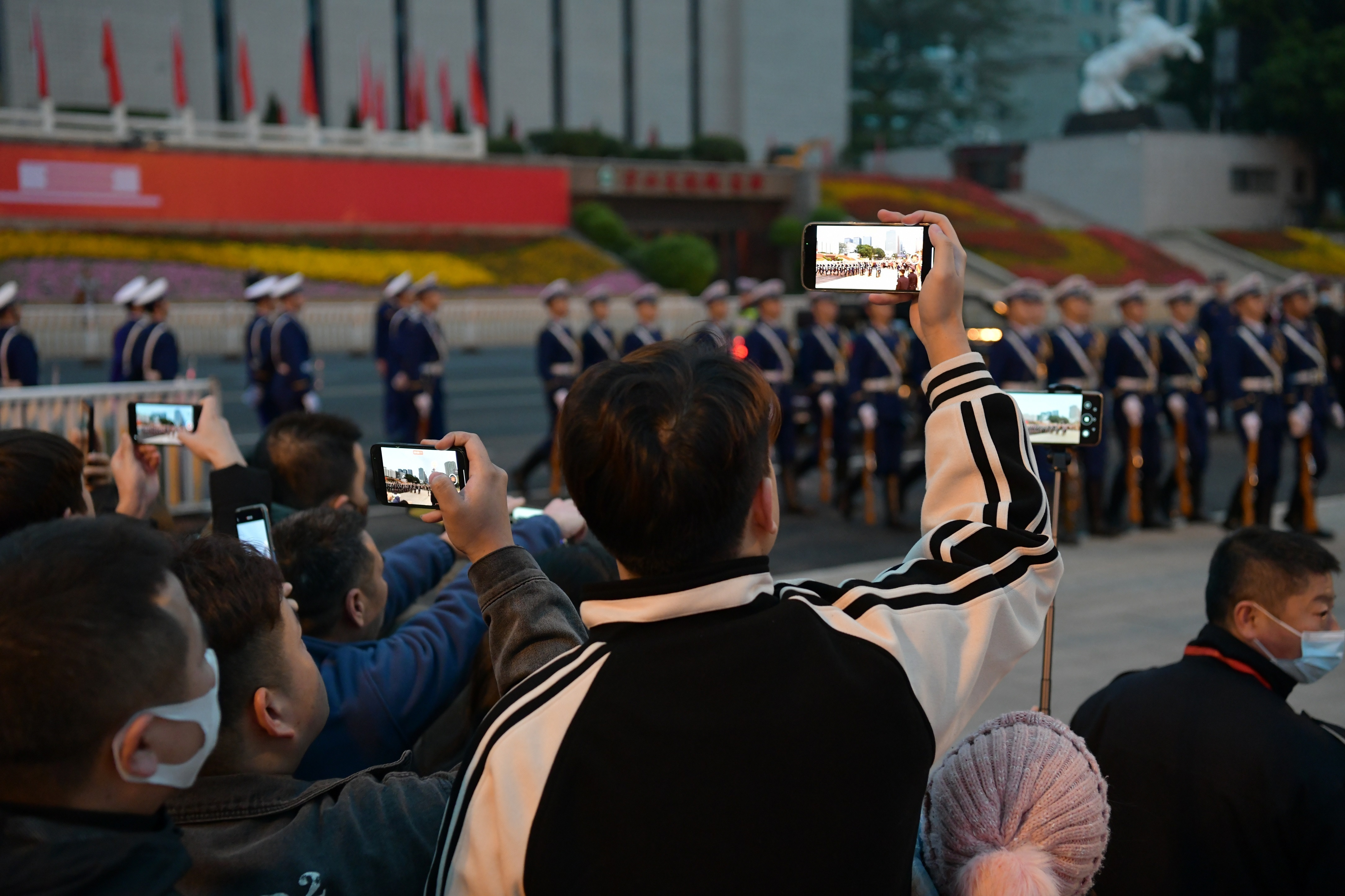 伴随着雄壮的国歌奏响和一声铿锵豪迈的“向国旗,敬礼”,升旗手右手向空中一扬,鲜艳的五星红旗在五一广场缓缓升起,护卫队员庄严敬礼,少先队员行少先队礼,群众立正行注目礼。