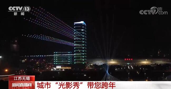 2021年12月31日晚,在江苏无锡的映月湖广场上举行了“城市之光”光影秀,喜迎新年。在夜空中,由800架无人机组成的编队以新年、祝福等为主题呈现五彩缤纷的图案,增添了节日的喜庆氛围。