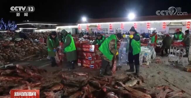 在吉林松原查干湖的冰院子中,渔工师傅们在辛劳地进行着冬捕作业,连夜从冰面上运回的鱼在这里形成了鱼山鱼海。几条大胖头鱼上面顶着一条红色的鲤鱼,也给新年带来一个好的寓意。