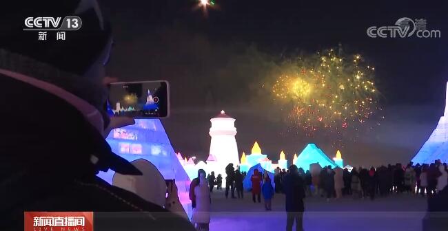 在黑龙江哈尔滨的冰雪大世界,民众在这里游玩赏灯,观看烟花表演。