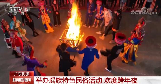 在广东韶关乳源瑶族自治县,2021年12月31日晚上10时左右,活动现场生起了苒苒篝火,瑶族群众手拉手围着火堆跳起了民族舞蹈,寓意着新的一年红红火火。