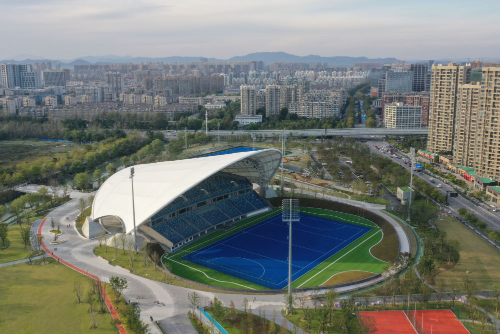 ⬆️这是2021年11月9日在大运河亚运公园拍摄的“杭州伞”体育场(无人机照片),亚运会期间为曲棍球项目的比赛场地。