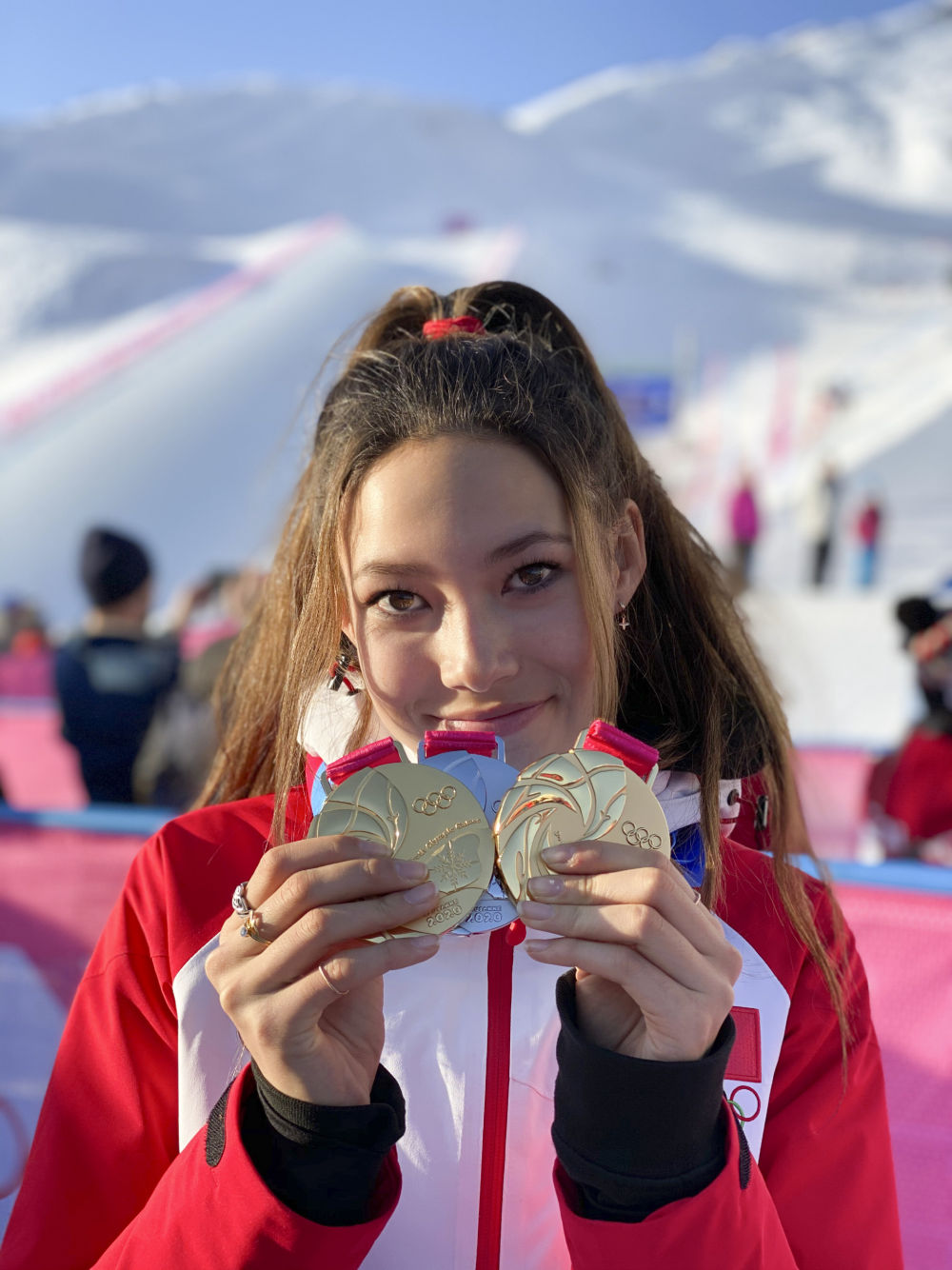 ⬆️2020年1月22日,谷爱凌在第三届冬季青年奥林匹克运动会自由式滑雪女子大跳台颁奖仪式后展示她获得的三枚奖牌。