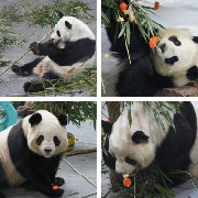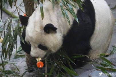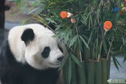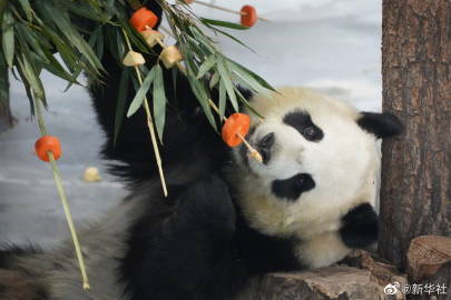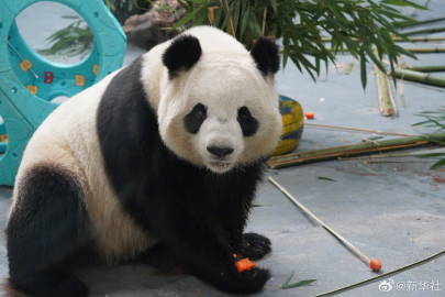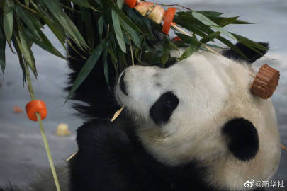 【#大熊猫过元旦#】2022年元旦,在位于青海省西宁市的西宁熊猫馆,饲养员用胡萝卜、苹果、竹子等食材,为馆里的4只大熊猫准备了丰盛的节日大餐。不少游客也在当天来到西宁熊猫馆参观,欢度元旦。
