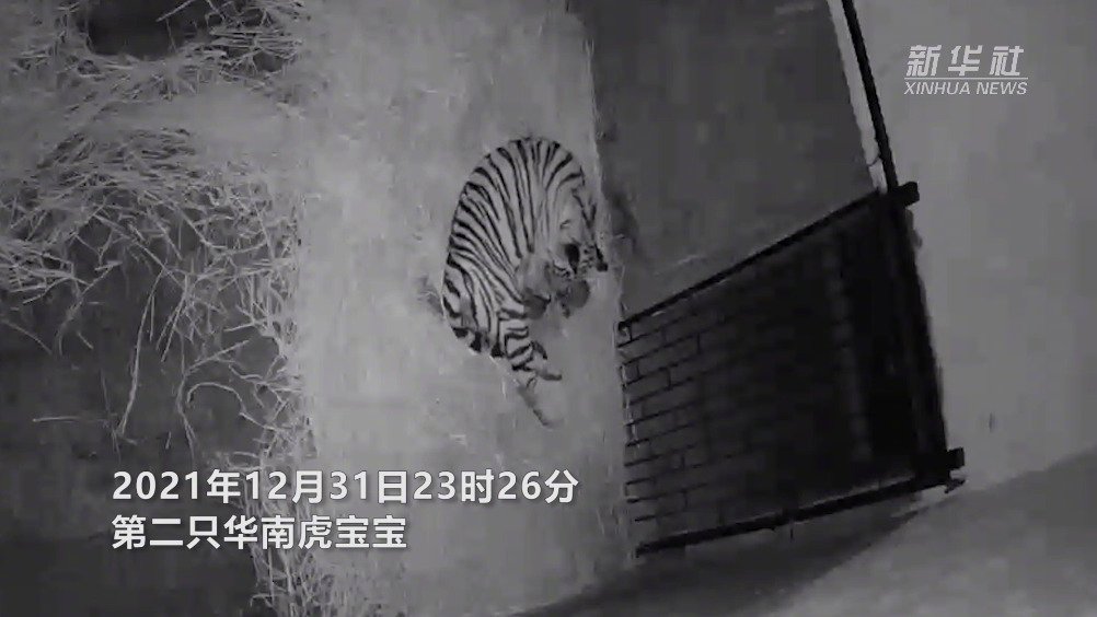 【#广东韶关跨年夜喜迎华南虎双胞胎#】2021年12月31日“跨年夜”,广东韶关华南虎繁育研究基地的华南虎“梦梦”顺利产下两只华南虎幼崽。华南虎是国家一级保护动物,是中国特有虎亚种,也是濒危物种,目前全国仅存200多只,均为人工饲养。(记者胡林果、黄国保) 新华社的微博视频