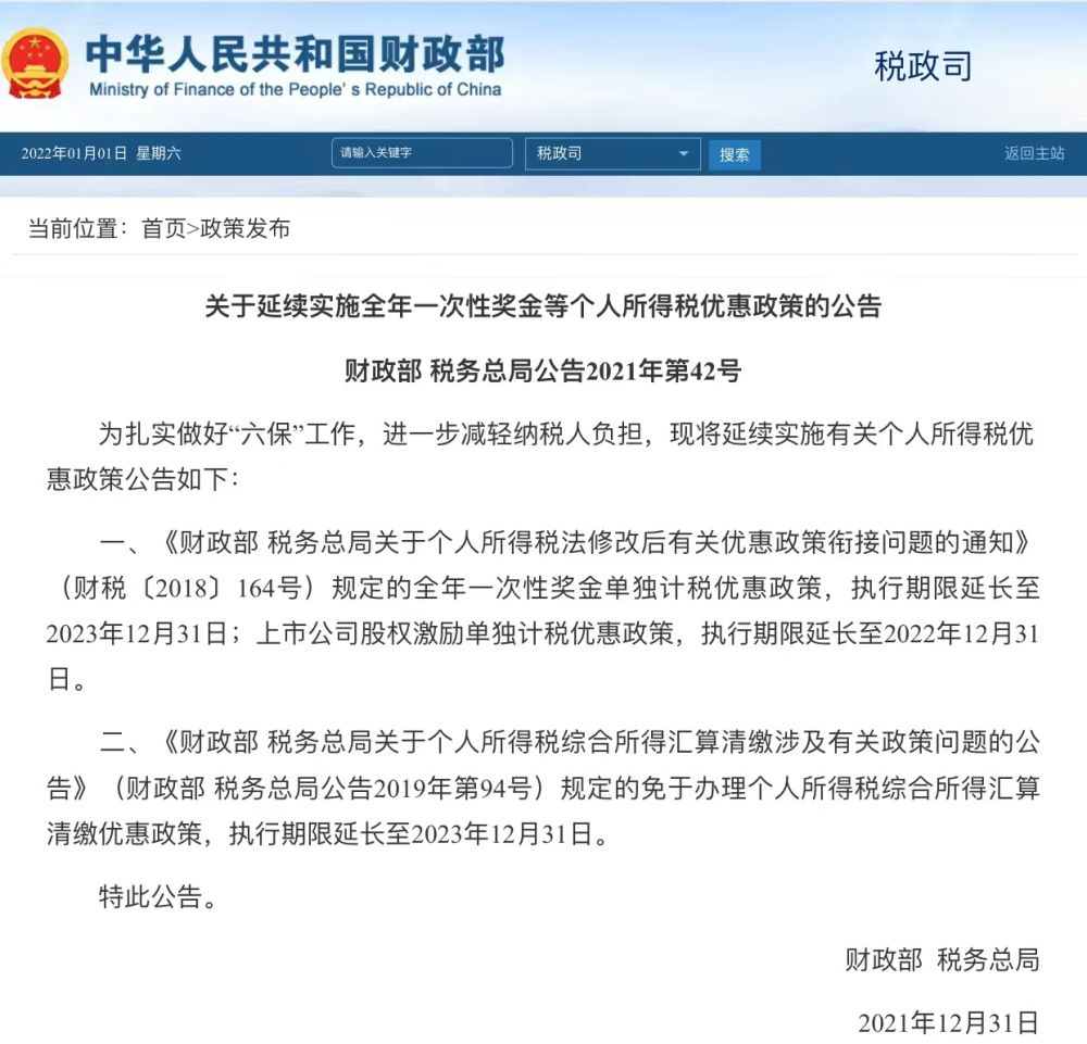 日前召开的国务院常务会议,决定延续实施部分个人所得税优惠政策。财政部、国家税务总局2021年12月31日发布公告,进一步明确全年一次性奖金单独计税、上市公司股权激励单独计税等多项税收优惠政策继续执行。详情>>