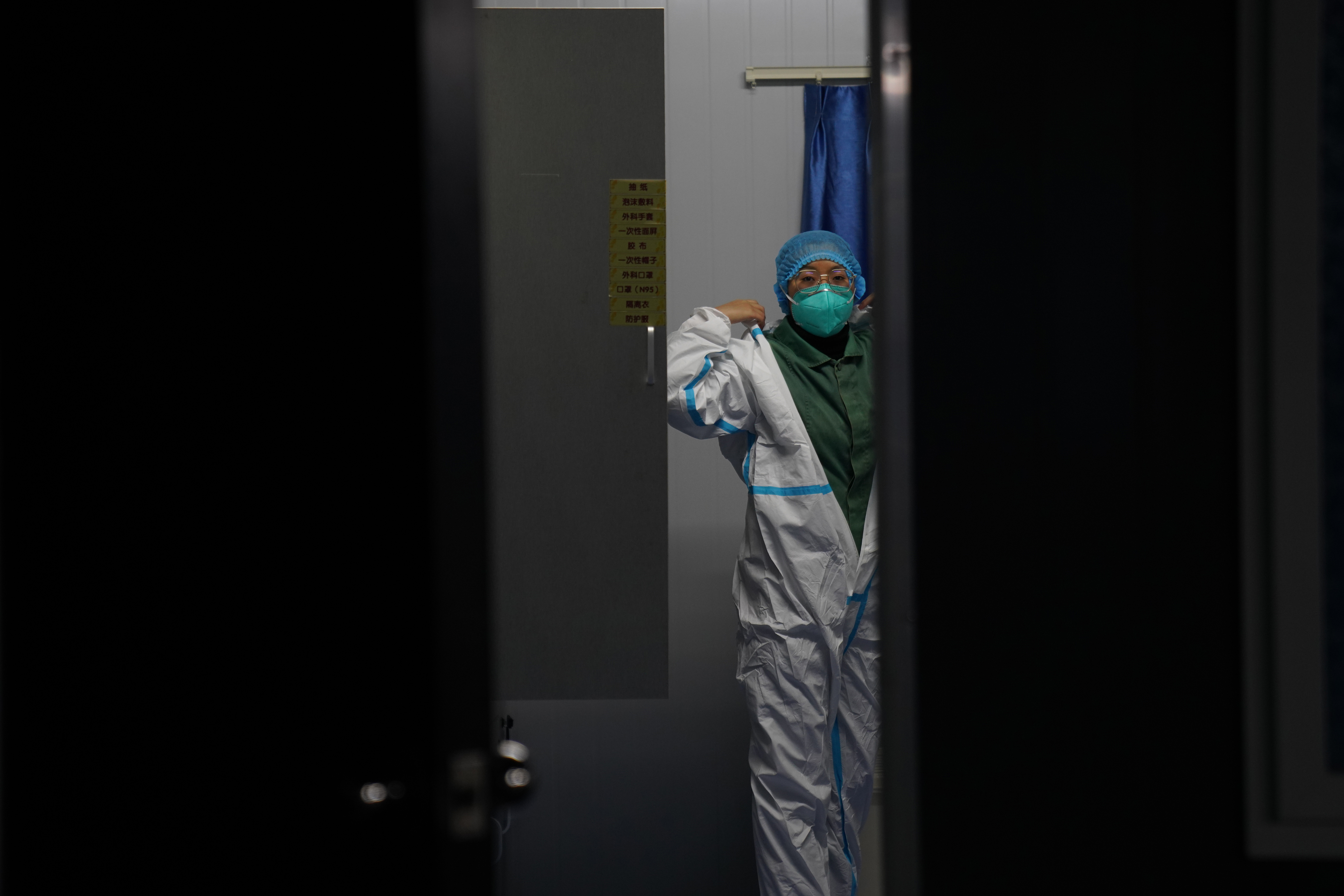 图为2021年12月31日晚,医护人员正在穿防护服。重庆市中医院供图