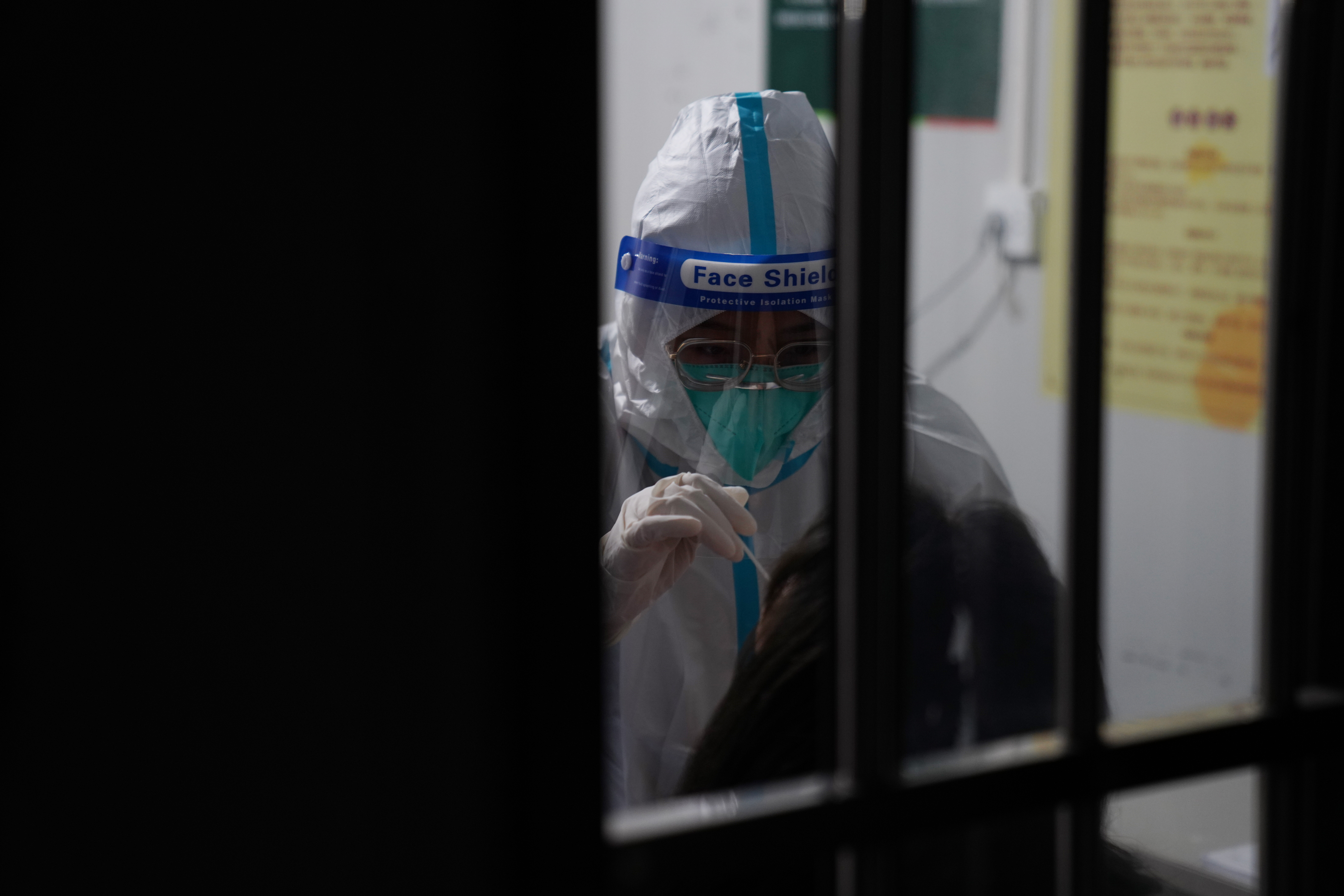 图为2021年12月31日晚,医护人员正在采集核酸样本。重庆市中医院供图