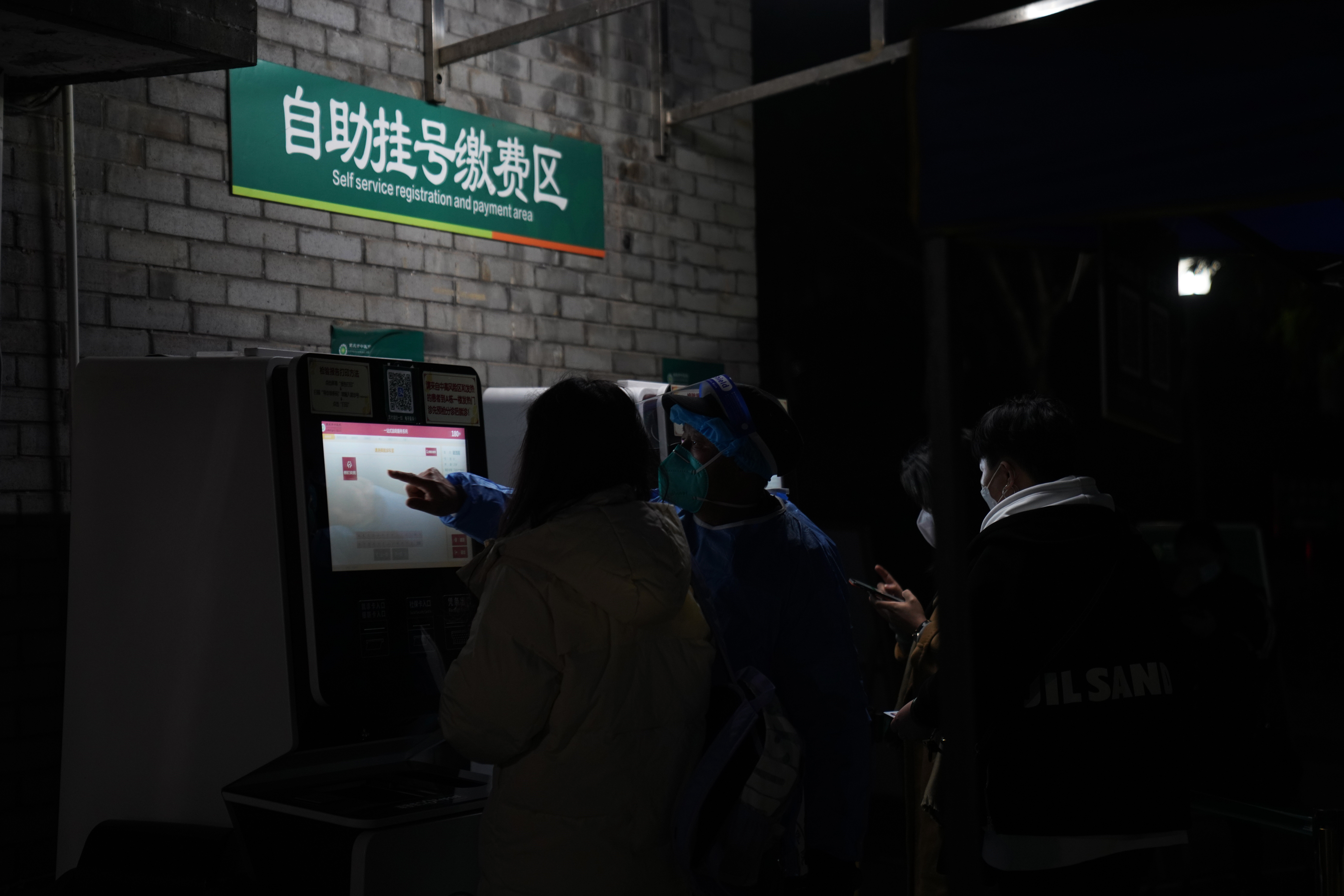 图为2021年12月31日晚,市民在医护人员指引下登记信息。重庆市中医院供图