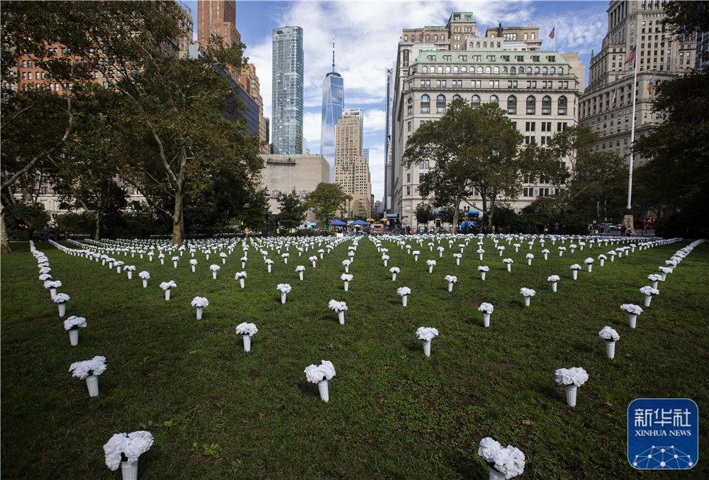 这是10月8日在美国纽约炮台公园内拍摄的为悼念枪支暴力遇难者摆放的白色瓶花。新华社记者 王迎 摄