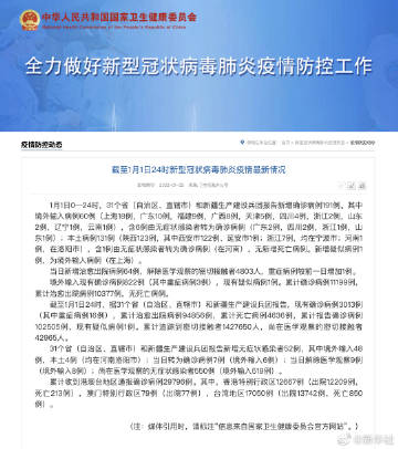 截至1月1日24时,据31个省(自治区、直辖市)和新疆生产建设兵团报告,现有确诊病例3013例(其中重症病例16例),累计治愈出院病例94856例,累计死亡病例4636例,累计报告确诊病例102505例,现有疑似病例1例。累计追踪到密切接触者1427650人,尚在医学观察的密切接触者42965人。