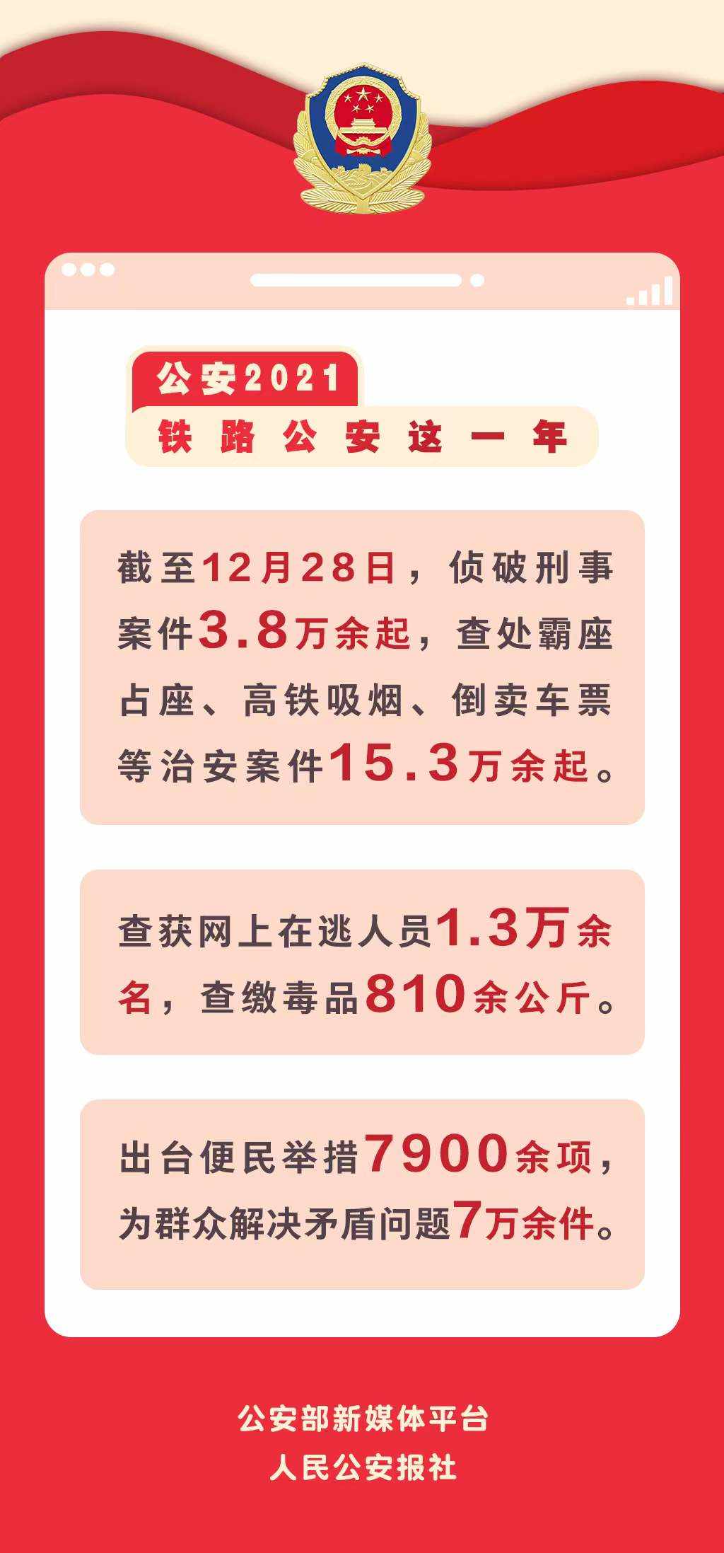 ——截至12月28日,侦破刑事案件3.8万余起,查处霸座占座、高铁吸烟、倒卖车票等治安案件15.3万余起,查获网上逃犯1.3万余名,查缴毒品810余公斤,有力维护了铁路治安秩序。