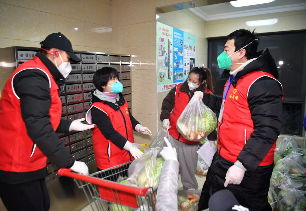 ↑2021年12月31日,在西安曲江风景线小区,志愿者为居民运送免费生活物资。