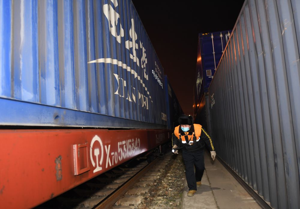 ↑2021年12月31日深夜,中国铁路西安局西安国际港站调车长周俊玺例行检查中欧班列长安号车列情况。2022年1月1日零时,中欧班列长安号新年首列开启新路线,为保障车辆安全运行,周俊玺在岗位上迎接新年到来。