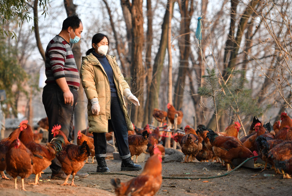 ↑2021年12月31日,王卫花(右)在西安市长安区一户养鸡的农户家了解情况。