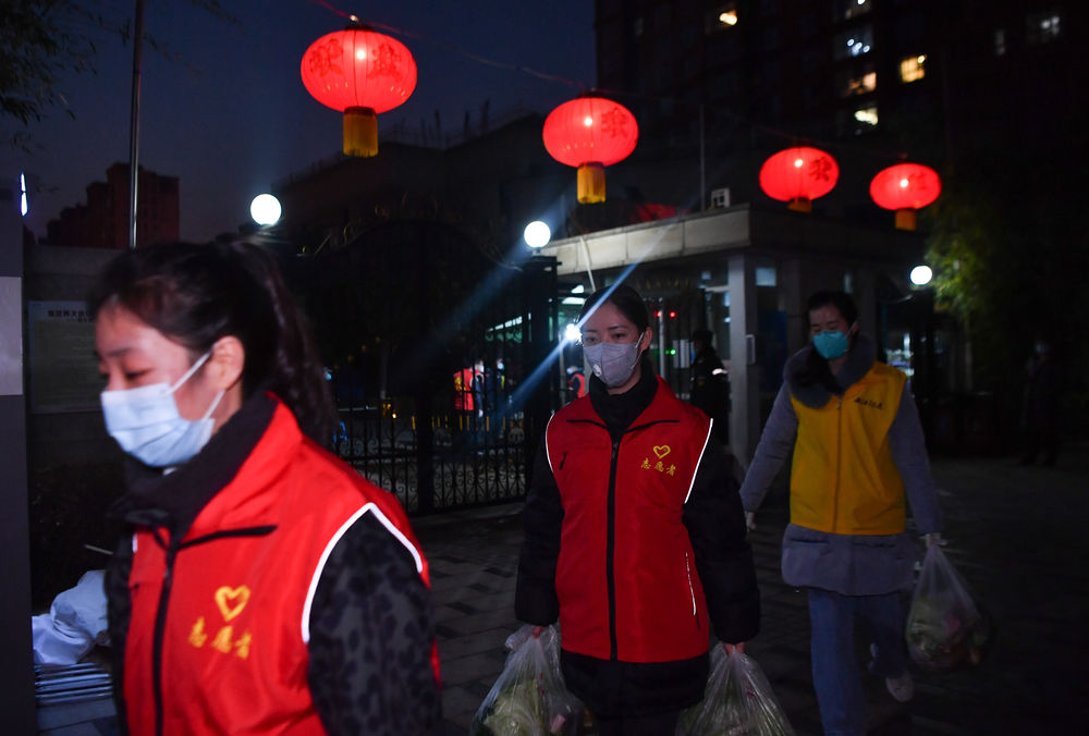 “欢度佳节”,小区门前的四盏大红灯笼分外耀眼。来自西安话剧院的志愿者正在紧张工作,从货车上小心翼翼地卸下政府免费为居民发放的鸡蛋、蔬菜等物资。志愿者廖旭阳使用酒精喷壶,仔细为每一袋物资的外包装进行消毒。