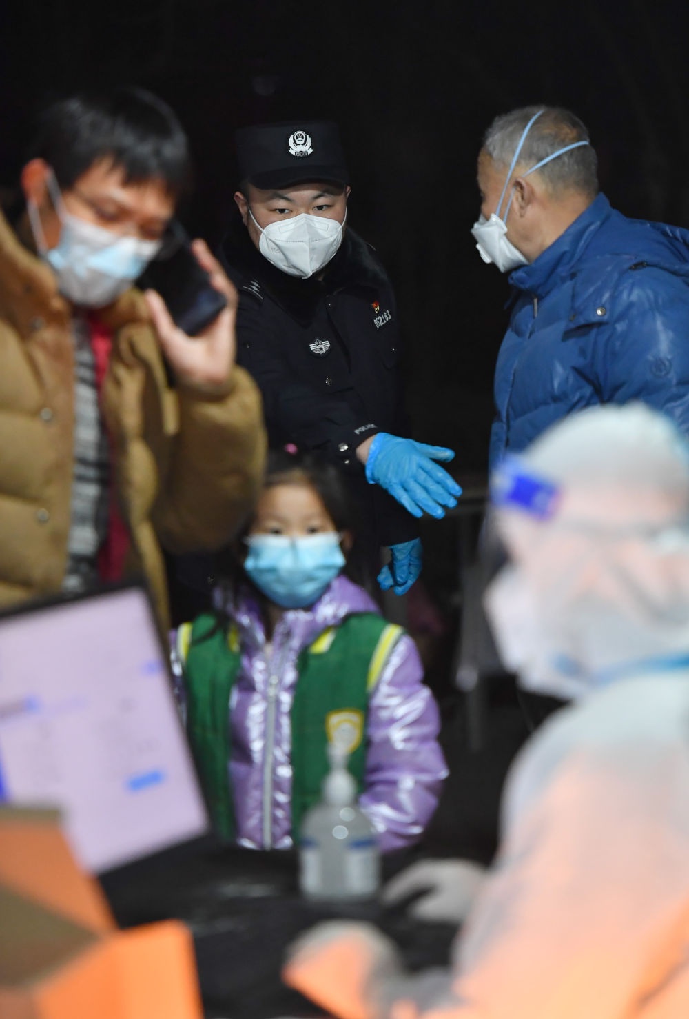 ↑2021年12月31日,西安市公安局高新分局丈八路派出所民警何磊(后排中间)在高新区一小区的核酸检测点维持排队秩序。