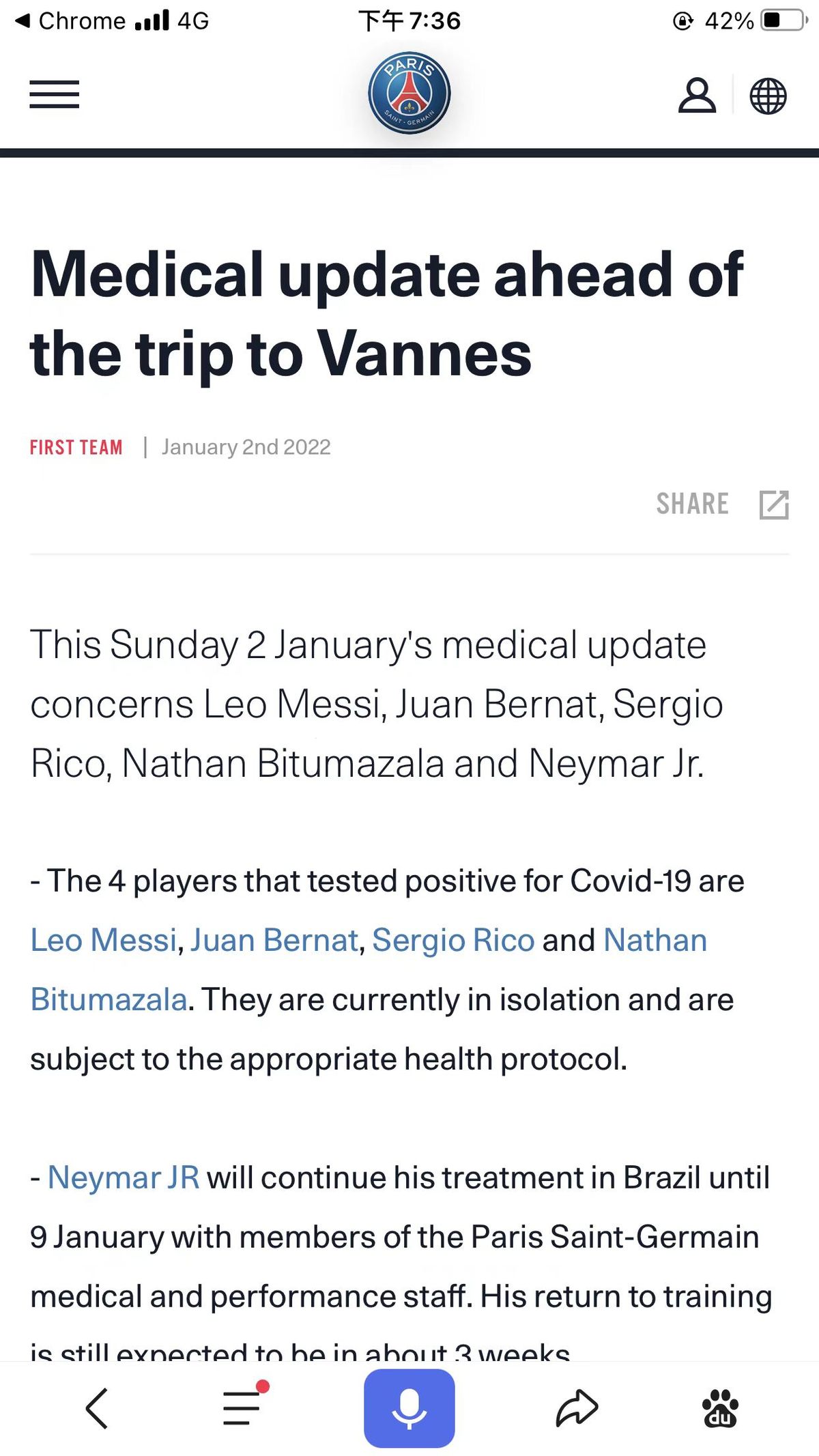 北京时间1月2日晚,法甲巴黎圣日耳曼俱乐部在官网发布消息,确认效力于该队的阿根廷球星梅西感染新冠病毒。