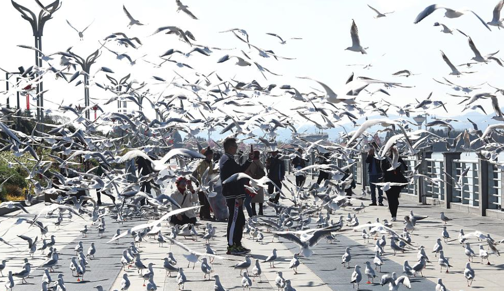 云南昆明市民与鸥共欢,滇池草海大坝红嘴鸥漫天飞舞,群鸥共舞的景致格外壮观。