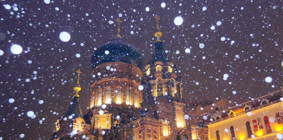 2022年1月1日傍晚,哈尔滨市迎来了2022年的首场雪。雪花为整座城市披上了一层银装,美丽的冰城变成一个白色的童话世界。