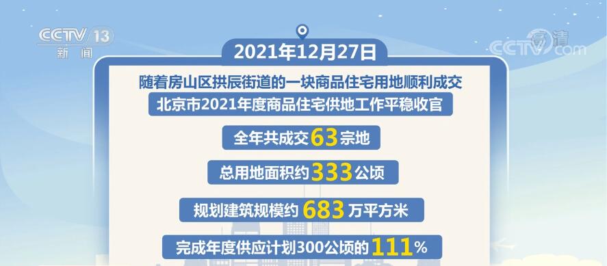 2021年12月27日,随着房山区拱辰街道的一块商品住宅用地顺利成交,至此,北京市2021年度商品住宅供地工作平稳收官。全年共成交63宗地,总用地面积约333公顷,规划建筑规模约683万平方米,完成年度供应计划300公顷的111%。成交商品住宅用地面积、规划建筑规模较去年全年增加10%。