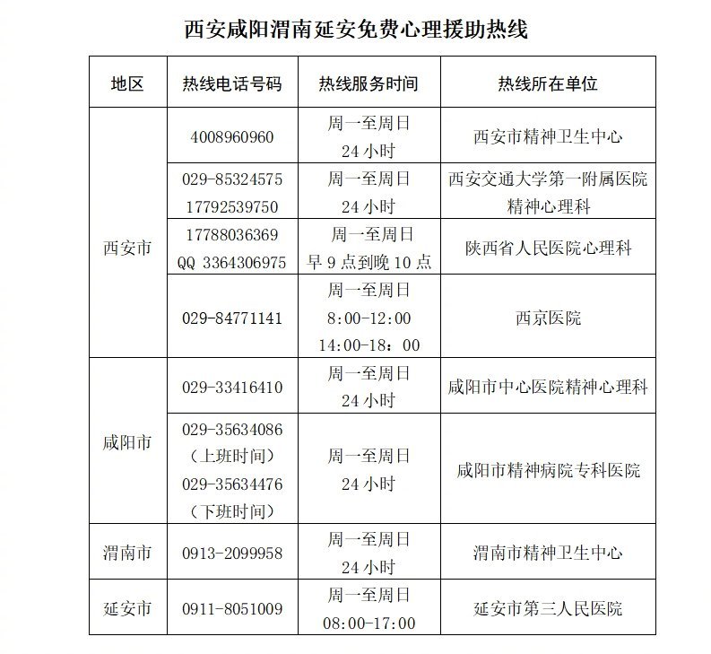 省新冠肺炎疫情医疗救治心理干预专家组,组建心理援助热线工作团队,24小时为疫情心理求助者提供心理援助服务。同时,省卫生健康委会同省政务服务中心在省12320卫生热线开通疫情心理援助热线专席,依托陕西12345对全省有关疫情心理干预的诉求进行引导和分转。