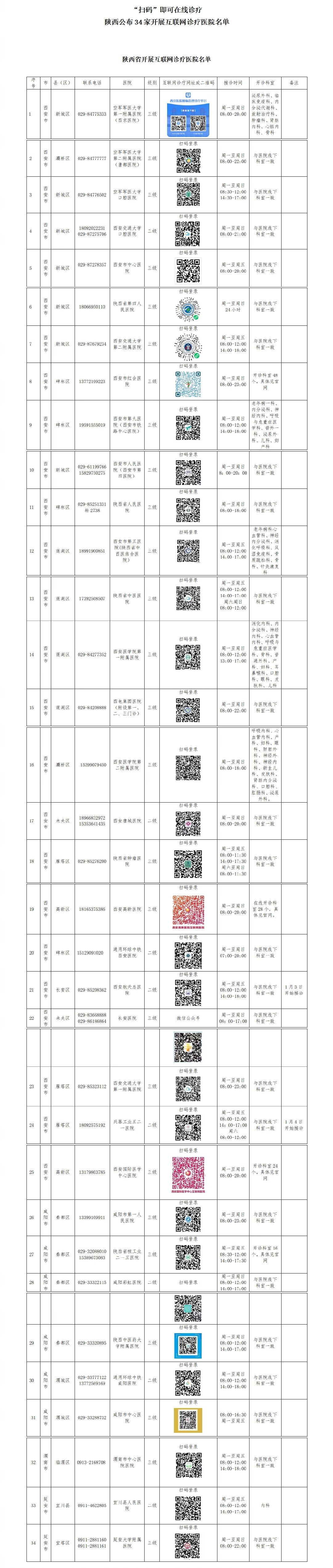 西安、咸阳、渭南、延安34家医院已上线互联网诊疗服务,广大患者可通过扫码登录访问医院的互联网诊疗平台即可获得问诊、复诊等线上医疗服务。名单如下: