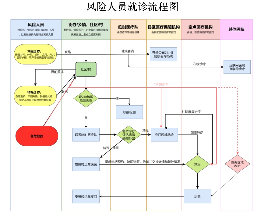 有急诊抢救医疗需求的风险人员,直接拨打120急救电话,同时通知社区(村)工作人员对接120救护车、填写人员交接单,由120救护车联系风险人员医疗保障医疗机构、定点医疗机构,或就近送至具备相应诊疗能力的医疗机构。诊疗结束后,医疗机构联系社区(村)由县区转运专班“点对点”接回。