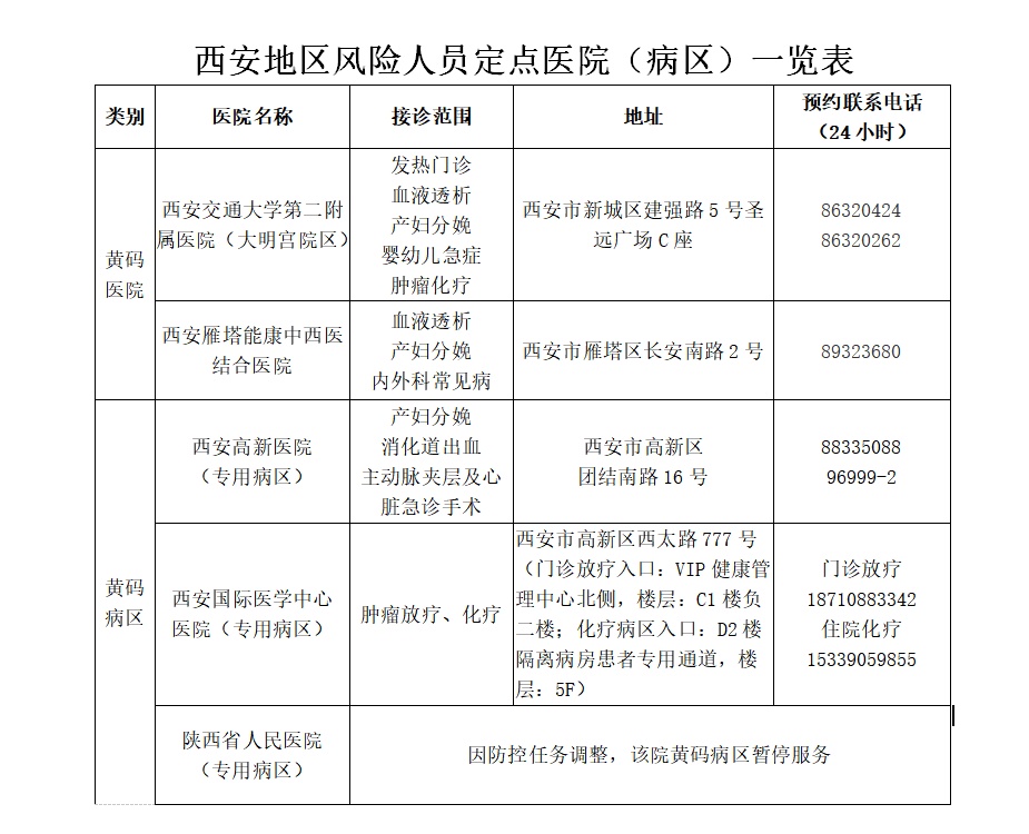 目前,经省市协调,西安地区已设立“黄码医院”2家“黄码病区”2个(名单见下表),后续开设的“黄码医院”“黄码病区”等风险人员定点医院(病区)由地市自行发布。