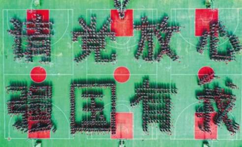 2021年9月1日,广西梧州商贸学校2000多名新生在操场上摆成“请党放心,强国有我”字样和心形图案。