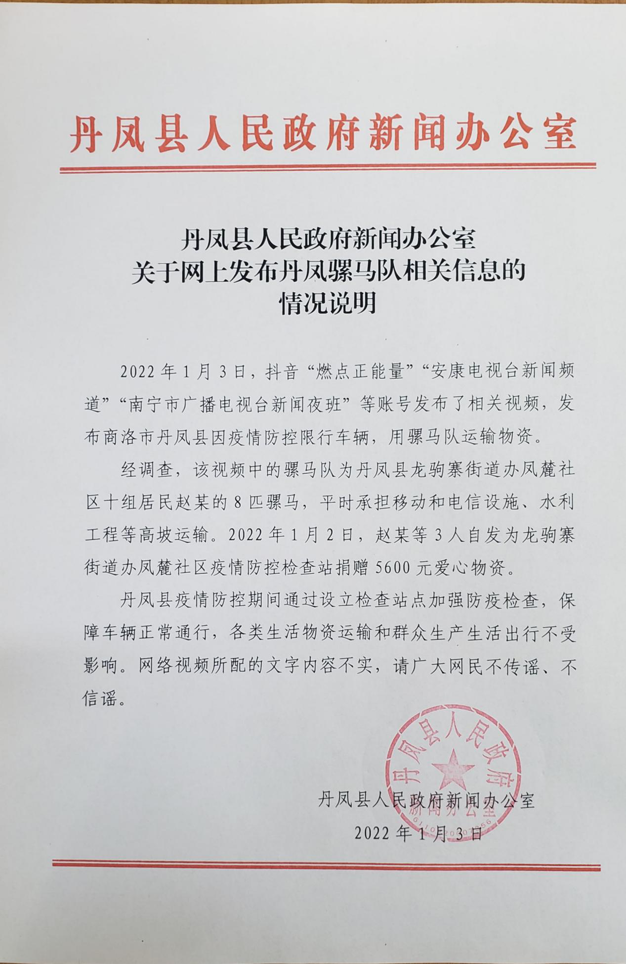 ·陕西丹凤因疫情防控限行车辆用马匹运抗疫物资?官方:不实,系骡马队运送捐赠物资。