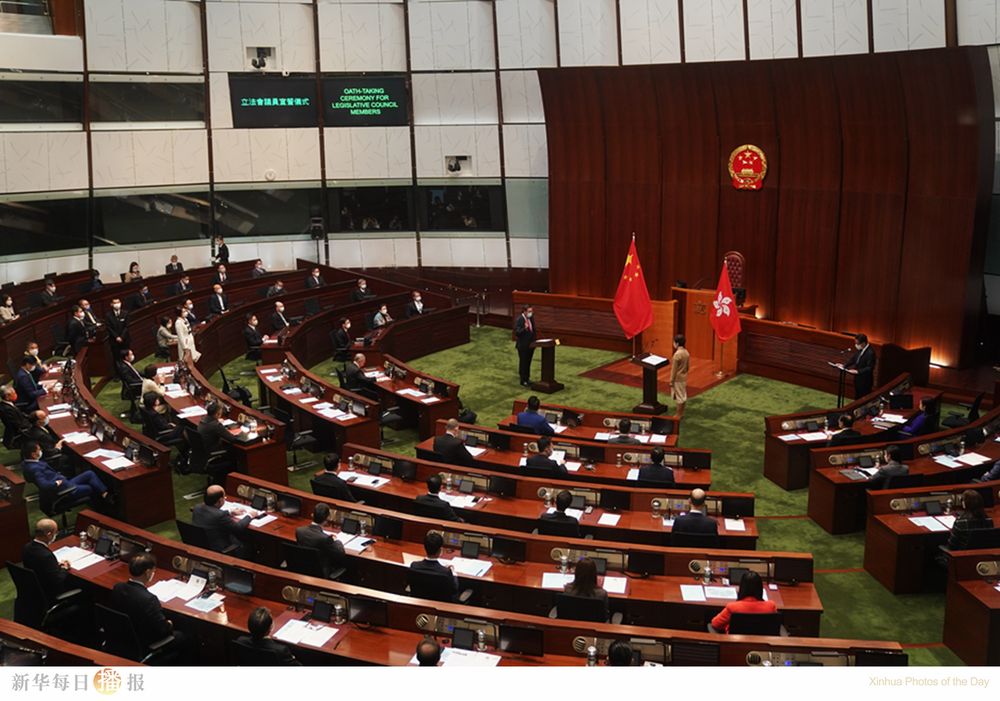 1月3日11时许,香港特区第七届立法会90位议员开始宣誓。香港特区行政长官林郑月娥为议员监誓。图为宣誓仪式现场。新华社记者 王申 摄
