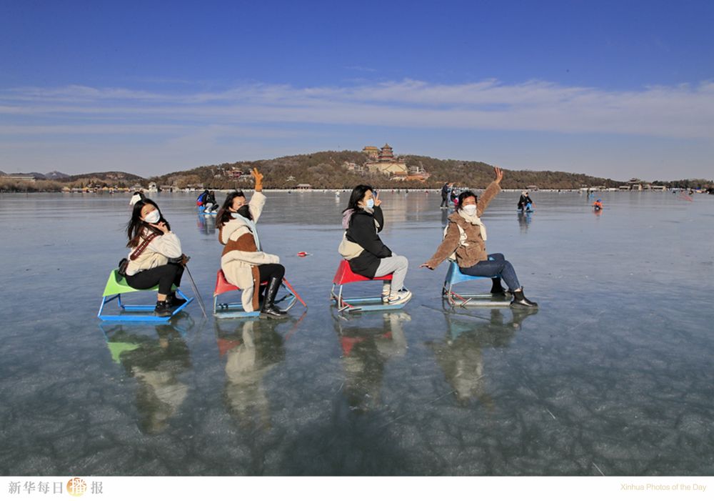 1月2日,游客在北京颐和园昆明湖冰场滑冰。元旦假期,人们来到滑雪场、滑冰场等冰雪场地,体验冰雪运动带来的乐趣,享受假日时光。新华社发(刘宪国 摄)