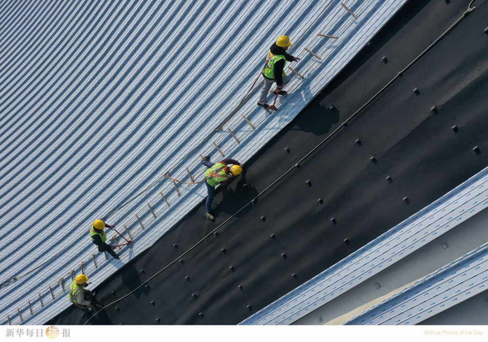 1月3日,工人在浙江省宁波市东钱湖国际会议中心进行屋顶安装作业。元旦假期,全国各地的许多建设者们坚守岗位,在工作中度过假期。新华社发(胡学军 摄)