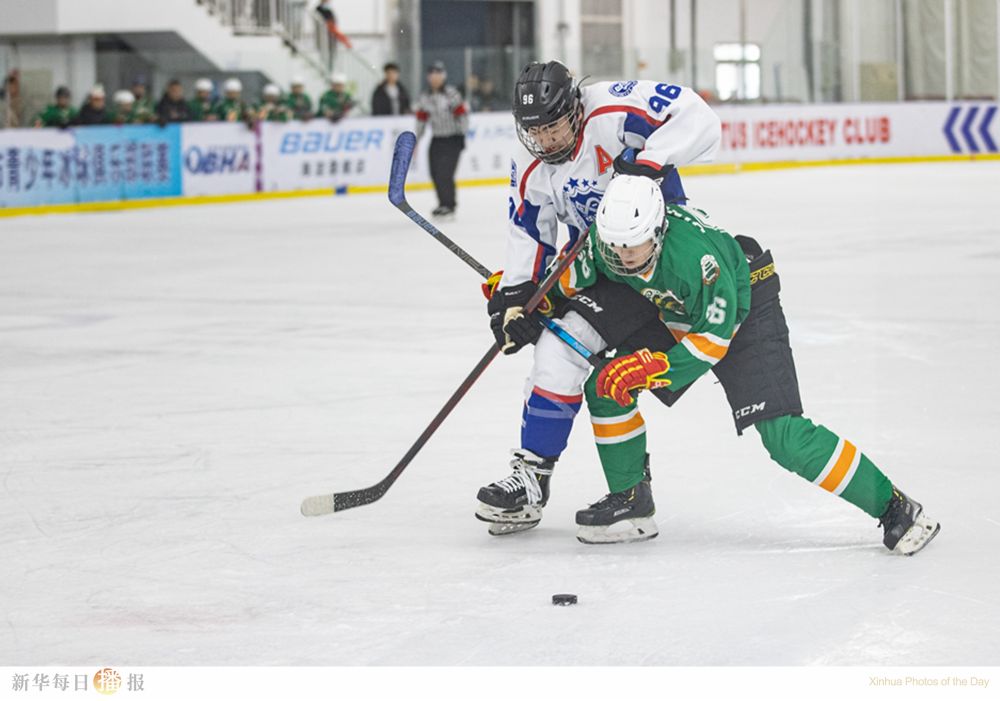 1月3日,2022年北京市高中校际冰球联赛(冬季站)在北京启迪冰雪体育中心进行最后一场比赛的角逐。最终,北京市十一学校冰球队以4比0战胜北京市二十中冰球队,从而以2胜1负积6分的成绩,获得本站比赛冠军。这是北京十一学校队球员魏子尧(左)与北京市二十中队球员秦盛铭在比赛中拼抢。新华社记者 吴壮 摄