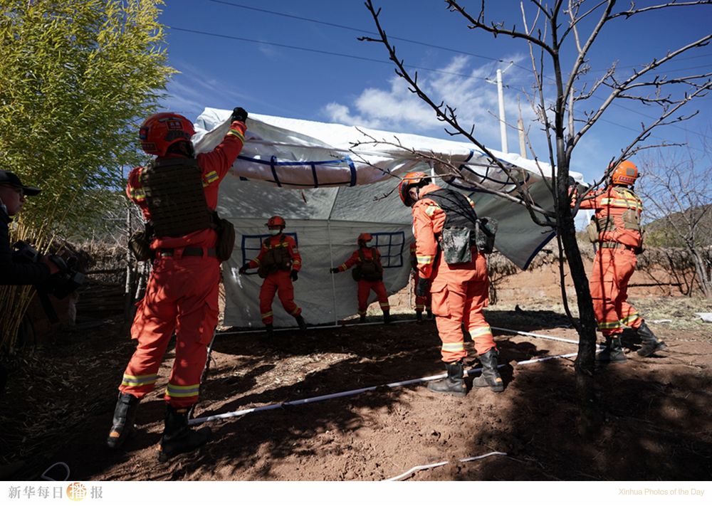 1月3日,云南宁蒗地震震中灾区救援有序展开。地震中受伤的22人均得到及时有效医治,受灾群众陆续搬进搭好的帐篷,相关救援物资正在发放。这是当日,森林消防队员在永宁镇温泉村为受灾群众搭建帐篷。新华社记者 陈欣波 摄