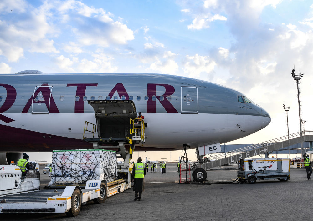 ↑2021年9月18日,在肯尼亚首都内罗毕,机场工作人员从飞机上卸下中国政府援助的新冠疫苗。
