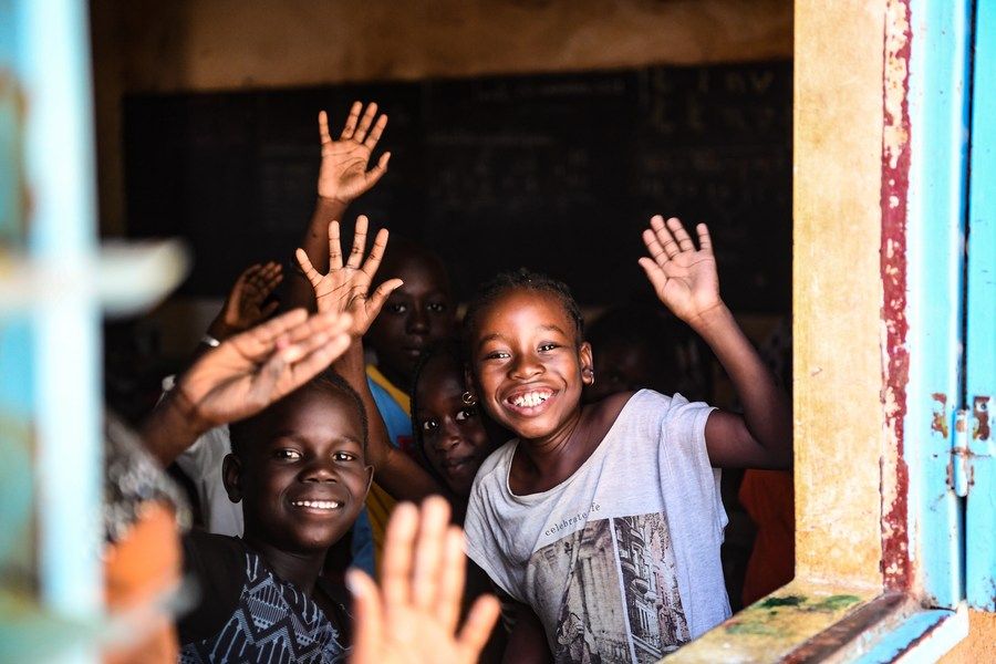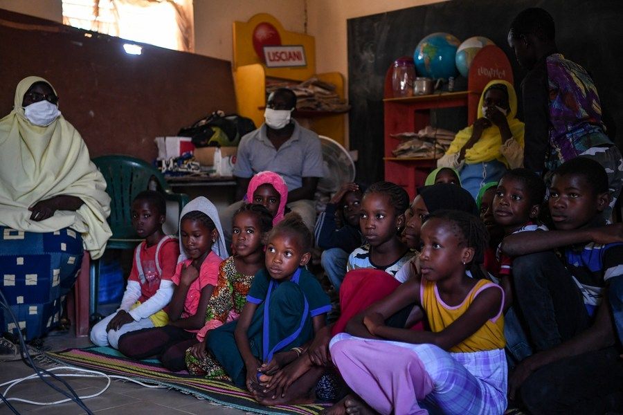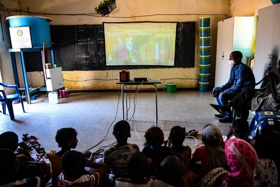 ↑2021年11月22日,在塞内加尔达喀尔近郊的辛迪亚小学,同学们坐在教室的地毯上观看投影播放的动画片。整套设备都是靠太阳能蓄电池供电。