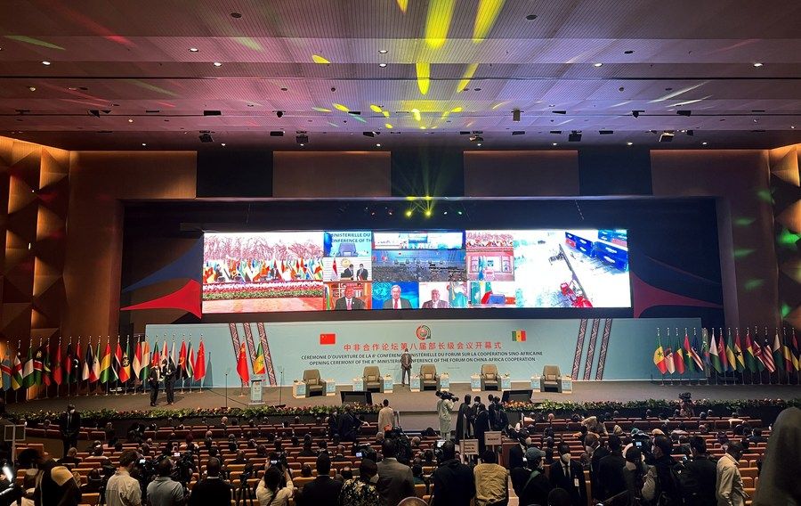 ↑2021年11月29日,在塞内加尔首都达喀尔,与会代表步入中非合作论坛第八届部长级会议开幕式现场。