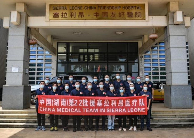 ↑2021年12月7日,在塞拉利昂塞中友好医院,中国(湖南)第22批援塞拉利昂医疗队即将结束任务回国之际,集体合影留念。