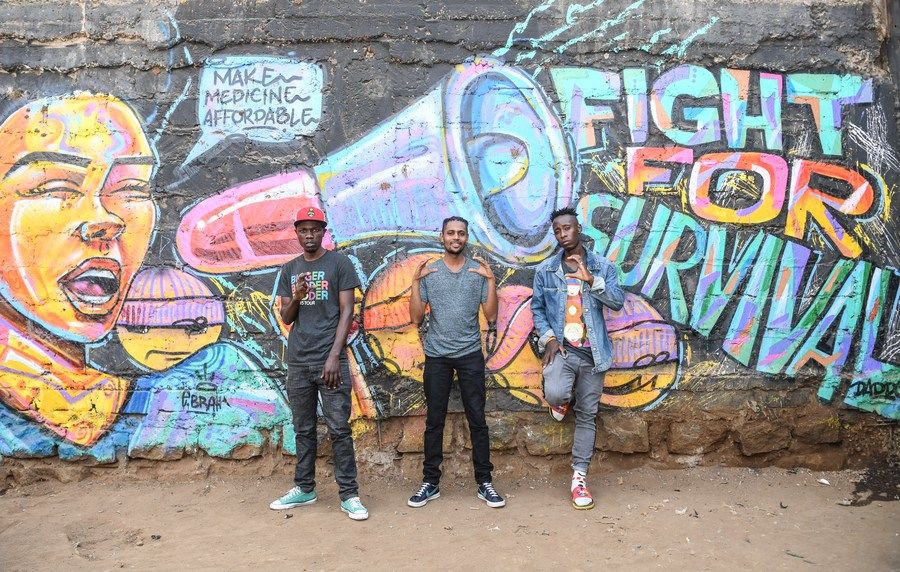 ↑2021年7月27日,“赛普勒斯”乐队成员在肯尼亚首都内罗毕的马萨雷贫民窟的一面涂鸦墙前摆出乐队的代表性手势。