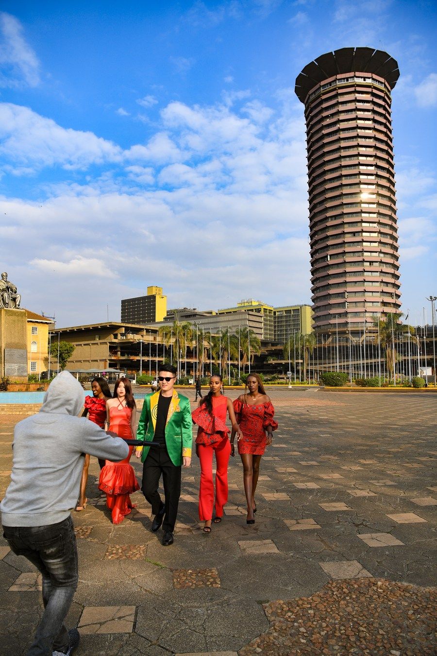 ↑2021年9月29日,在肯尼亚首都内罗毕,王垚(中)和助理们在拍摄短视频封面照片。
