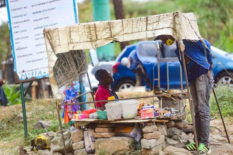 ↑2021年7月28日,在肯尼亚首都内罗毕街头,顾客在一处小摊前买东西。