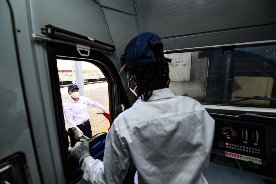 ↑2021年3月22日,在肯尼亚首都内罗毕,杨明和康西莉亚进行火车机车对接车厢工作。