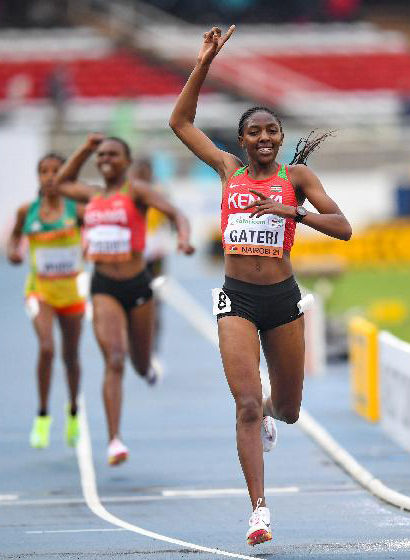 ↑2021年8月19日,在女子3000米决赛中,肯尼亚选手加泰里(前)获得冠军。