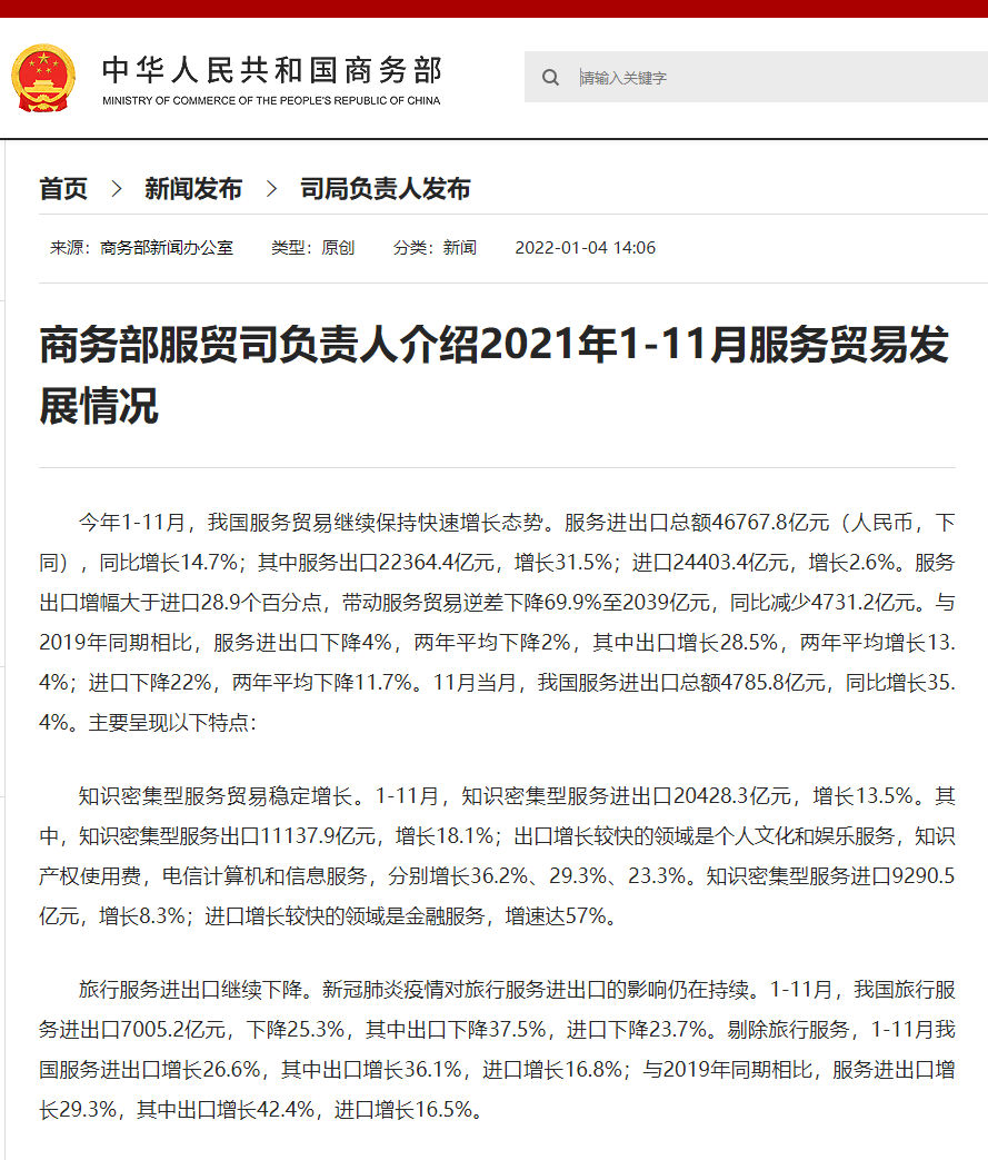 据商务部网站消息,今年1-11月,我国服务贸易继续保持快速增长态势。服务进出口总额46767.8亿元(人民币,下同),同比增长14.7%;其中服务出口22364.4亿元,增长31.5%;进口24403.4亿元,增长2.6%。服务出口增幅大于进口28.9个百分点,带动服务贸易逆差下降69.9%至2039亿元,同比减少4731.2亿元。与2019年同期相比,服务进出口下降4%,两年平均下降2%,其中出口增长28.5%,两年平均增长13.4%;进口下降22%,两年平均下降11.7%。11月当月,我国服务进出口总额4785.8亿元,同比增长35.4%。主要呈现以下特点: