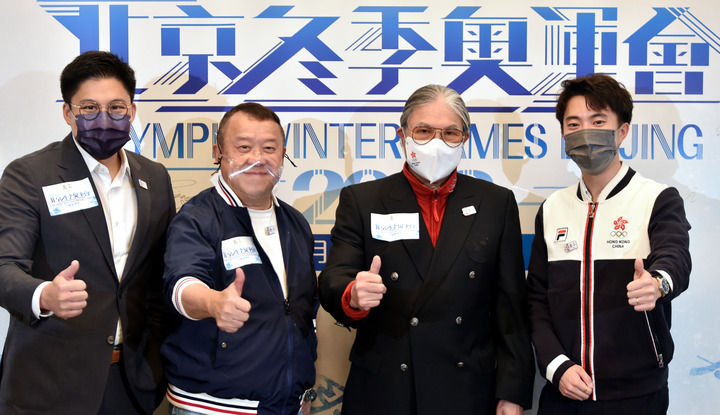 1月4日,中国香港体育协会暨奥林匹克委员会会长霍震霆(右二)、香港无线电视总经理曾志伟(左二)、中国香港体育协会暨奥林匹克委员会副会长霍启刚(左一),北京冬奥会中国香港代表队成员朱定文在发布会上合影。新华社记者 卢炳辉 摄