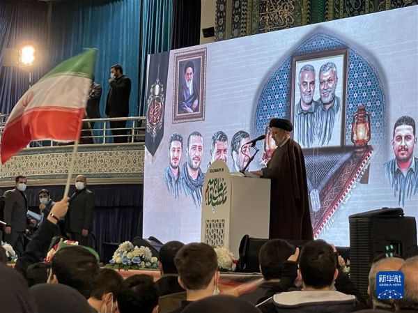 1月3日,在伊朗首都德黑兰,伊朗总统莱希在纪念苏莱曼尼大会上讲话。新华社记者 高文成 摄