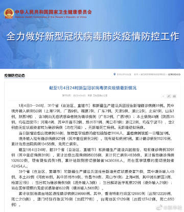截至1月4日24时,据31个省(自治区、直辖市)和新疆生产建设兵团报告,现有确诊病例3291例(其中重症病例31例),累计治愈出院病例95005例,累计死亡病例4636例,累计报告确诊病例102932例,现有疑似病例1例。累计追踪到密切接触者1438066人,尚在医学观察的密切接触者42454人。